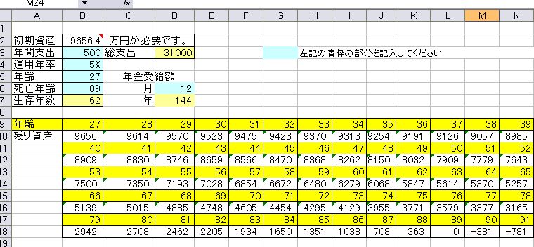 では下記のエクセルデータから今のあなたの年齢と生活費、運用年率、死亡年齢(適当で良いです)を打ち込んでみましょう。